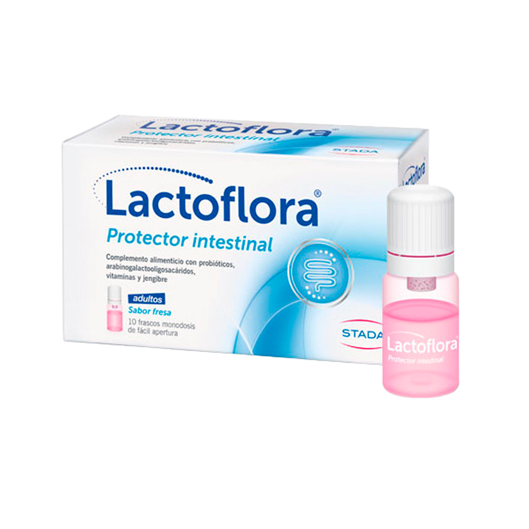 Simbiótico (mezcla de probióticos y fibra prebiótica) con vitaminas B (B1, B2, B3, B5, B6, B9,B12) y jengibre.